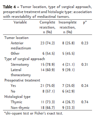 Although the location of mediastinal mass is critical to differential diagnosis of primary malignant mediastinal tumors,(1) our results show that this characteristic did not affect the ability to achieve complete surgical resection. Similarly, the type of surgical approach (sternotomy or thoracotomy) was not found to be associated with the completeness of resection. The type of surgical access should be considered in order to achieve adequate viewing and complete resection with tumor-free margins.