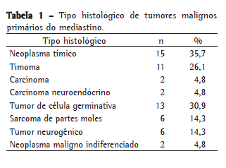 A mediana de idade foi de 39,5 anos (variação:, 1,0- 77,4 anos) e 30 (71,5%) dos 42 pacientes eram homens. Cinco pacientes eram assintomáticos. A manifestação clínica inicial mais comum foi dor no peito, relatada por 18 pacientes (42,8%). A mediana da duração dos sintomas foi de 4 meses (variação: 1-36 meses). A maioria (73,8%) dos tumores estava localizada no compartimento anterior do mediastino, enquanto 19,1% estavam localizados no compartimento posterior e 7,1% no compartimento médio. Neoplasias malignas do timo e tumores germinativos foram os tipos histológicos mais comuns, como mostra a Tabela 1. De acordo com os exames radiológicos, o tumor estava restrito ao mediastino, sem invasão das estruturas adjacentes, em 14 pacientes (33,3%). Entre os demais 28 pacientes (66,6%), nos quais havia evidências radiológicas de tumor infiltrado em órgãos adjacentes, havia invasão do parênquima pulmonar em 18, em grandes vasos em 5, no pericárdio em 6 e na parede torácica em 7. Todos os 28 pacientes foram submetidos à cirurgia como tratamento primário. A quimioterapia pré-operatória foi administrada em 13 (31,0%) dos 42 pacientes. Um paciente (2,4%) foi tratado com quimioterapia e radioterapia antes da ressecção cirúrgica. O tipo do acesso cirúrgico pelo tórax foi selecionado caso a caso pelo cirurgião. A abordagem cirúrgica mais comum foi a esternotomia mediana, empregada em 19 pacientes (45,3%), seguida pela toracotomia lateral esquerda, em 14 (25,0%), e a toracotomia lateral direita, em 9 (21,4%). A ressecção das estruturas adjacentes foi realizada em 24 pacientes (57,2%). O parênquima pulmonar foi a estrutura ressecada com maior frequência: a ressecção em cunha/segmentectomia foi realizada em 12 pacientes (28,6%); a lobectomia em 2 (4,8%), e a pneumonectomia em 1 (2,4%). As seguintes estruturas também foram ressecadas: o pericárdio adjacente em 5 pacientes (11,9%); a pleura parietal em 5 (11,9%); a parede torácica em 4 (9,6%); o nervo frênico em 2 (4,8%); e a veia cava superior (ressecção parcial) em 1 (2,4%).
