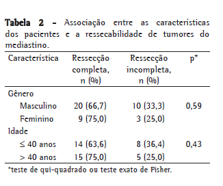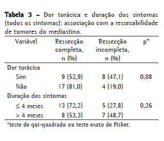 O gênero e a idade não foram associados à ressecabilidade do tumor do mediastino (Tabela 2). Os pacientes com dor torácica como manifestação clínica inicial apresentaram tendência à impossibilidade de ressecção na cirurgia. A Tabela 3 mostra que a ressecção foi incompleta em 47,1% desses pacientes. No entanto, essa diferença não atingiu significância estatística (p = 0,08).
