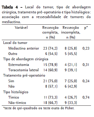 A localização anatômica do tumor maligno primário (compartimento anterior, médio ou posterior do mediastino) não foi associada à capacidade de se obter a ressecção completa e nem ao tipo de abordagem cirúrgica (esternotomia ou toracotomia lateral). Como se pode ver na Tabela 4, o mesmo foi verdadeiro para o tratamento pré-operatório (tratamento neoadjuvante ou sem tratamento) e o tipo histológico do tumor maligno primário do mediastino (tímico ou não-tímico).