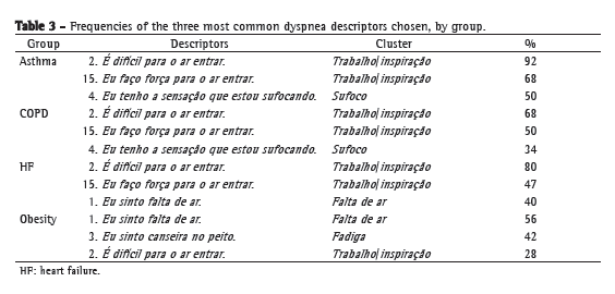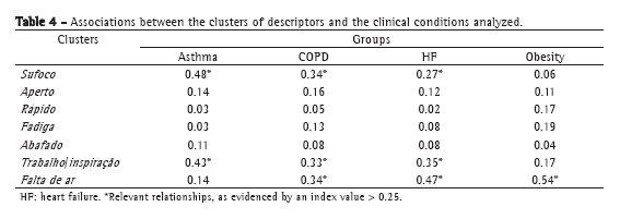 In the present study, we also attempted to establish associations between the clusters obtained and the four types of conditions analyzed. Asthma was significantly associated with the sufoco and trabalho/inspiração clusters, whereas COPD and heart failure were associated with the sufoco, trabalho/inspiração, and falta de ar clusters. Obesity was associated only with the falta de ar cluster. Overlapping of descriptors was therefore quite common among the patients, regardless of their clinical condition, and the use of such descriptors was not useful in differentiating among the conditions, which is in disagreement with what has been proposed by various authors. However, our results are in agreement with those of certain other studies, which reported that the use of dyspnea descriptors is not sufficiently specific for differential diagnoses, because they reflect sensations that are shared by a variety of conditions.(26-28)