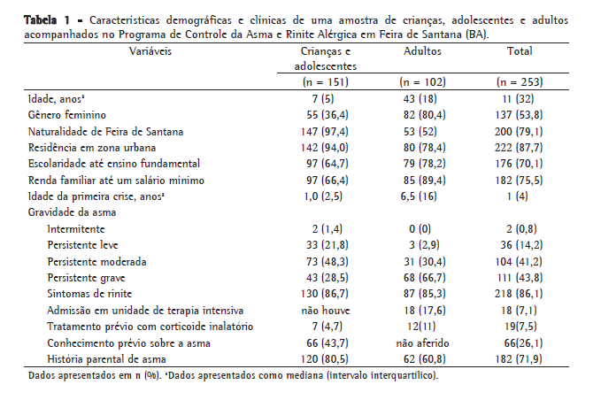 As características demográficas e clínicas da população estão ilustradas na Tabela 1. A amostra foi composta por 253 pacientes (107 crianças, 44 adolescentes e 102 adultos). A frequência de crianças e adolescentes do sexo masculino em relação ao sexo feminino foi de 2,6:1 (63,6% vs. 36,4%), enquanto, nos adultos, essa relação favoreceu o sexo feminino numa proporção de 4:1 (80,4% vs. 19,6%). Escolaridade até o ensino fundamental foi o mais comum nas mães de crianças e adolescentes (64,7%) e entre pacientes adultos com asma (78,2%). A renda familiar mais observada foi de até um salário mínimo (75,5%). Asma grave foi significativamente mais frequente nos adultos (66,7%), e apenas 7,5% da amostra total utilizou corticoide inalatório antes do programa. A coexistência de rinite alérgica e asma ocorreu em 219 pacientes (86,3%), e 139 (63,5%) fizeram uso de medicação para tratamento da rinite (corticoide tópico nasal e/ou anti-histamínico).