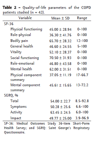 Sociodemographic and clinical data for all patients were collected in an interview. The quality-of-life questionnaires SGRQ and SF-36 were administered on the same day by the same interviewer. Both questionnaires have been translated and validated for use in Brazil.(13,14) Sociodemographic data, such as gender, age and marital status, were collected, as were clinical and laboratory data regarding the following: disease duration in years; functional class according to the GOLD criteria(12); smoking history in years; comorbidities; arterial blood gas analysis; 6MWT in meters; and spirometry with a bronchodilator test.