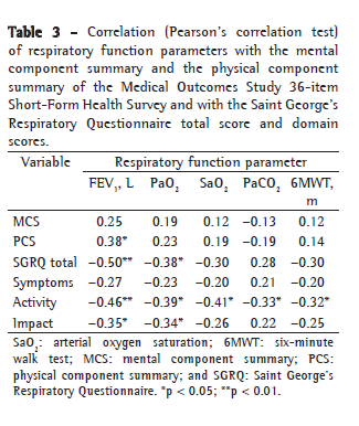 Various studies have assessed quality of life and correlated it with respiratory function parameters. However, the results are discrepant. Although some studies showed a correlation between respiratory function parameters and quality of life,(3-5) others found no such correlation.(6-8)