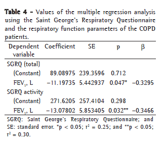 The multivariate analysis of the present study revealed that only FEV1 correlated with the SGRQ total score and with the SGRQ activity domain score (r = −0.32; p = 0.04 and r = −0.34; p = 0.03, respectively). The impact of variables such as FEV1 on quality of life, as assessed using the SGRQ, has not been demonstrated in other studies that used multivariate analysis.(6,8)