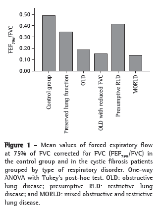 Figure 1 compares the normal individuals and the CF patients, grouped by type of respiratory disorder, in terms of FEF75%/FVC value. There were no statistically significant differences among the control group, the preserved lung function group and the presumptive RLD group, although these groups differed significantly from the OLD group, the OLD with reduced FVC group and the MORLD group, which did not differ among themselves (p < 0.001).