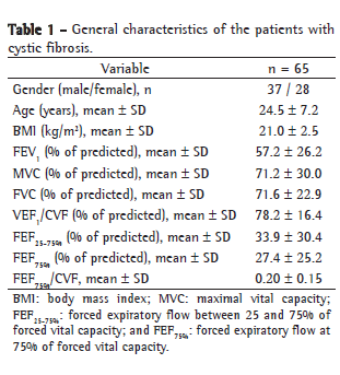 The objective of the present study was to assess spirometric patterns of respiratory disorders and determine their relationship with functional severity and end-expiratory flow parameters in adolescents and adults with CF treated at a referral center for the disease.