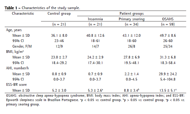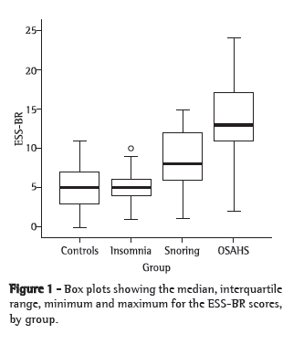 In another study, the ESS scores for the insomnia group were slightly lower than were those for the control group, although the difference did not quite reach statistical significance.(19) However, in the present study, there was a significant difference between the primary snoring group and the control group in terms of the ESS-BR score. The relationship between snoring and EDS has previously been suggested.(26) In the present study, this difference might be attributable due to a selection bias, since most of the patients in the primary snoring group were referred for polysomnography due to clinical suspicion of OSAHS. In addition, some of these patients might have had increased airway resistance. Furthermore, the use of a thermistor rather than a nasal cannula during polysomnography might have resulted in the underdiagnosis of respiratory disorders in the primary snoring group patients.
