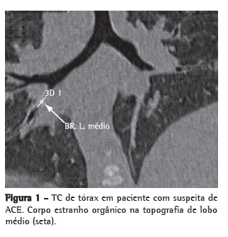 A ACE é uma importante causa de dificuldade respiratória em crianças principalmente na faixa etária compreendida entre 6 e 24 meses. Frente a um paciente com suspeita dessa condição, após o levantamento da história e a realização de exame clínico minuciosos, a avaliação radiológica é o primeiro passo da investigação. Os achados radiográficos mais comuns são aprisionamento aéreo, atelectasias e sombras por CE radiopacos.(7,8) Entretanto, esses achados são muito inespecíficos e de baixa acurácia.