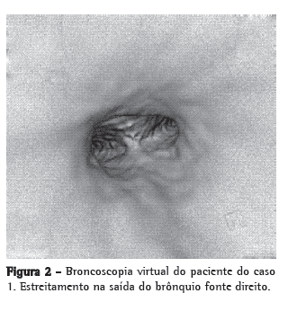 O aparelho usado para a realização dos exames foi um tomógrafo multi-detector de 64 canais (SOMATOM Sensation 64; Siemens, Erlangen, Alemanha), equipado com Care Dose 4D, um dispositivo que modula a radiação emitida de acordo com a espessura do tecido estudado. A espessura dos cortes foi de 1 mm, com passo de mesa (pitch) de 1,4; o regime radiográfico foi de 120 kVp, com 45 mA e tempo de exposição de 3,53 s. Os pacientes foram sedados com hidrato de cloral a 15%, na dose de 50 mg/kg. O broncoscópio rígido utilizado para a remoção do CE de um dos pacientes (ver Caso 1) tinha 3,5 mm de diâmetro (Karl Storz Instruments, Tuttlingen, Alemanha), e a criança foi sedada com propofol durante o procedimento.