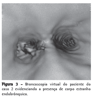 A aspiração de corpo estranho (ACE) para o trato respiratório é um problema comum em pacientes pediátricos, em especial abaixo dos três anos de idade. Na avaliação radiológica inicial, cerca de 30% dos pacientes apresentam radiograma de tórax normal. A tomografia com broncoscopia virtual (BV) pode auxiliar no diagnóstico precoce desse quadro e seu pronto manejo. O tratamento definitivo se dá com a retirada do corpo estranho através de broncoscopia rígida e mediante anestesia geral. O objetivo deste trabalho foi descrever o uso da BV na abordagem de dois pacientes com suspeita de ACE e realizar uma revisão da literatura sobre este tópico. Os dois pacientes tiveram início súbito de sintomas respiratórios e relato de tosse ou engasgo com alimentos antecedendo o quadro. Os pacientes foram submetidos à BV, e foi detectada a presença de corpo estranho endobrônquico em ambos os casos, com remoção posterior por broncoscopia rígida convencional em um caso. A BV é um método não-invasivo recente e com potencial para detectar a presença de corpo estranho na via respiratória em crianças. Em casos selecionados, BV pode auxiliar na localização correta do corpo estranho e até mesmo evitar o procedimento de broncoscopia rígida na ausência de corpo estranho.