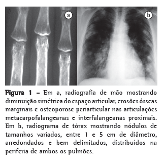 A radiografia de mãos e punhos evidenciou diminuição simétrica do espaço articular, erosões ósseas marginais e osteoporose periarticular nas articulações metacarpofalangeanas e interfalangeanas proximais (Figura 1a).