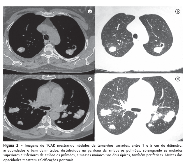 A TCAR do tórax revelou nódulos redondos bilaterais, bem delimitados, de distribuição periférica e, nos ápices, nódulos não maiores que 5 cm com as mesmas características. Muitas das opacidades mostravam calcificações pontuais. Pequenos nódulos centrolobulares, com atenuação em vidro fosco discreta, em regiões superiores de ambos os pulmões. Presença de adenopatia calcificada no mediastino (Figura 2).