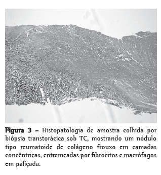 Realizada biópsia transtorácica sob TC de um nódulo de 5 cm periférico, em região posterior do pulmão esquerdo, cuja análise histopatológica mostrou ser um nódulo tipo reumatoide de colágeno frouxo em camadas concêntricas entremeadas por fibrócitos e macrófagos em paliçada, com partículas birrefringentes de entremeio (Figura 3).