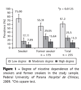Of the 629 study patients, 76 (12.1%) were smokers, 179 (28.5%) were former smokers, and 374 (59.5%) were nonsmokers. Of the 76 smokers, 32 (42.1%) were male and 44 (57.9%) were female (Table 1). Among the smokers, 89.5% reported willingness to quit smoking and 84.2% had attempted to quit smoking at least once. Among the former smokers, the most common reasons for smoking cessation were those related to maintaining or recovering health and to pregnancy (in 56.4%), and 95.5% reported having quit smoking using willpower alone. The smoking cessation rate was 0.70 (95% CI: 0.64-0.76). The mean age of the smokers was 47.1 ± 12.5 years (range 18-76 years), whereas the mean age of the former smokers was 52.3 ± 14.6 (range, 18-84 years; p = 0.0070). The mean age at smoking initiation among the smokers and the former smokers was 16.3 ± 5.9 years (range, 6-46 years) and 16.1 ± 4.8 years (range: 5-35 years), respectively (p = 0.8379). The median smoking history among the smokers and the former smokers was 11.2 pack-years (limits, 0.05-245.0) and 20.0 pack-years (limits, 0.05-320.0) , respectively (p = 0.0292). Among the smokers, the degree of nicotine dependence, as determined by the FTND, was found to be low in 57 respondents (75.0%), moderate in 13 (17.1%), and high in 6 (7.9%); whereas, among the former smokers, a low, moderate, and high degree of nicotine dependence affected 99 (55.3%), 52 (29.1%), and 28 (15.6%), respectively (p = 0.0125; Figure 1). Seventy-two smokers (94.7%) and 166 former smokers (92.7%) had been asked about their smoking habits. Of those, 17 smokers (22.4%) and 30 former smokers (16.8%) had received smoking cessation counseling from their physicians, and 57 (22.4%) reported being aware of the local (Curitiba) smoking control program. The two groups did not differ significantly regarding gender, age at smoking initiation, physician inquiry about smoking, or physician counseling regarding smoking cessation (Table 2).