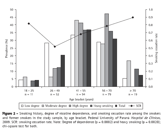 Smoking history was measured in pack-years, which is an indicator calculated by multiplying the number of packs of cigarettes smoked per day by the number of years of consumption. The degree of nicotine dependence was determined by administering the Brazilian Portuguese-language version of the Fagerström Test for Nicotine Dependence (FTND) crafted by Carmo & Pueyo.(7) Heavy smokers were defined as those who reported smoking more than 20 cigarettes per day. The smoking cessation rate, which corresponds to the percentage of former smokers among those who have smoked at least once in their lifetime, is the ratio between the number of former smokers and the sum of the numbers of current and former smokers.(8)