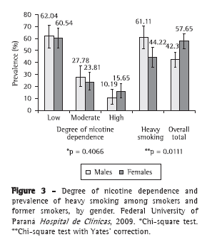 In 2009, the prevalence of smoking in adults in Brazil ranged from 8.0% in the city of Aracajú to 22.5% in the city of Porto Alegre. In all Brazilian capitals, the smoking habit was more prevalent among males.(10) In Curitiba, the overall prevalence of smoking was 19.3% (95% CI: 16.9- 21.8); among males, the prevalence of smoking was 23.0% (95% CI: 19.0-26.9), compared with 16.1% (95% CI: 13.1-19.2) among females, and the latter two rates are, respectively, the third and fourth highest smoking prevalence rates reported in Brazilian capitals.(10)