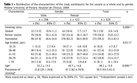 The prevalence of smoking found among the patients at the HC-UFPR in the present study (12.1%; 95% CI: 9.5-14.9) is significantly lower than that reported for adults in Brazil (16.1%), for adults in Curitiba (19.3%; 95% CI: 16.9-21.8), and for inpatients at the Botucatu School of Medicine Hospital das Clínicas, located in the state of São Paulo, Brazil (22.6%; 95% CI: 16.8-29.3).(10,11)