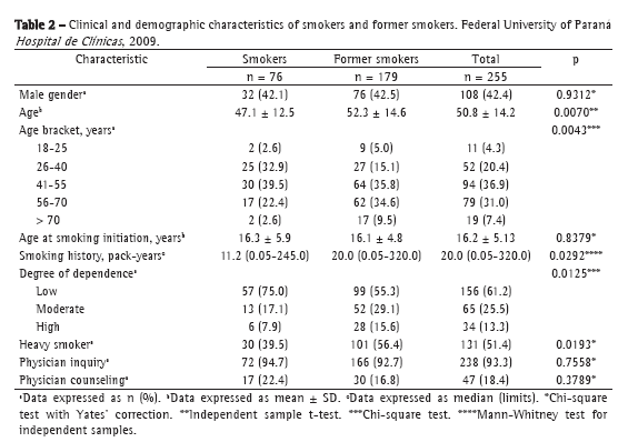 For the descriptive analysis, quantitative variables with non-normal distribution (as determined by the Shapiro-Wilk test) were summarized as means and standard deviations, whereas those with normal distribution were summarized as medians and limits. Categorical variables were summarized as frequencies and percentages with 95% CIs. In order to compare the groups (smokers vs. former smokers), we used the independent sample t-test or ANOVA for quantitative variables with normal distribution and the Mann-Whitney test for those with non-normal distribution. For categorical variables, we used the chi-square test or Fischer's exact test, when recommended. The level of statistical significance was set at p < 0.05.(9) We used the STATISTICA software, version 7.0 (StatSoft Inc., Tulsa, OK, USA).