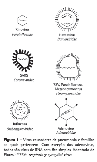 Portanto, entre os vírus causadores de pneumonia comunitária, encontram-se influenza A e B, RSV, parainfluenza, metapneumovírus, coronavírus, rinovírus, hantavírus e adenovírus. Um esquema da estrutura desses vírus é mostrado na Figura 1.(14)