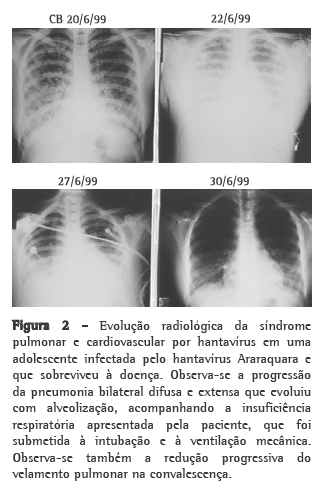 Os hantavírus pertencem à família Bunyaviridae. A infecção humana por esses vírus leva à SPCVH, uma doença emergente nas Américas, causada pela aspiração de aerossóis dos dejetos de roedores silvestres (Sigmodontinae) contaminados por esses vírus. No Brasil, ocorre SPCVH desde 1993, com cerca de 1.100 casos notificados até 2008. São conhecidos no Brasil como causadores de doença humana os hantavírus Araraquara, Juquitiba, Castelo dos Sonhos, Rio Mearim e Laguna Negra-símile. Analisando, entre 1998 e 2007, uma casuística de 70 pacientes com SPCVH na região de Ribeirão Preto (SP), observou-se uma maior incidência da doença entre abril e setembro, época de estiagem. Dentre os pacientes, 75,7% eram do sexo masculino, com 35,8 ± 11,7 anos em média. Esses pacientes, após incubação de 2 a 30 dias, apresentaram dispneia (87%), febre (81%), tosse (44%) e cefaleia (34%), por 3-6 dias (média de 4), sintomas acompanhados de taquicardia (81%), hipotensão arterial (56%), diminuição da SaO2 (49%), acidose metabólica (57%), linfocitopenia (51%), hematócrito > 45 mg% (70%), leucocitose com desvio à esquerda (67%), creatinina (51%) e ureia (42%) séricas elevadas. Além disso, apresentavam alteração radiológica com velamento bilateral, difuso, intersticial entre o primeiro e o quarto dia de doença e seguindo com alveolização, como mostra a Figura 2. A evolução para insuficiência respiratória, hipotensão arterial e choque ocorreu 24-48 h após o início dos sintomas, e a maior frequência de óbitos ocorreu no quarto dia de doença. Hematócrito elevado e plaquetopenia foram sinais fortemente sugestivos da doença. Também, a hipótese diagnóstica de pneumonia atípica foi associada a bom prognóstico (p = 0,0136) e, por outro lado, a infusão hídrica parenteral de mais que 2.000 mL e a hipotensão arterial foram associadas a mau prognóstico (p = 0,0286 e p = 0,0453, respectivamente). O contato com roedores infectados mostrou-se um fator de risco para a transmissão e a morbidade (p = 0,0198). Nessa casuística de indivíduos com SPCVH causada pelo vírus Araraquara, a letalidade foi de 54,3%.(22)