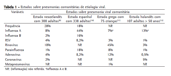 Não são numerosos os estudos sobre viroses causando pneumonias comunitárias. Entretanto, nos últimos anos, surgem trabalhos sobre esse assunto utilizando múltiplas abordagens diagnósticas e incluindo as modernas técnicas já citadas. Algumas dessas publicações encontram-se resumidas na Tabela 1. Em um trabalho realizado na Nova Zelândia com 300 indivíduos adultos apresentando pneumonia comunitária, 28% eram de etiologia viral e, nesses pacientes, encontraram-se rinovírus (10%), influenza A (8%), influenza B (2%), RSV (4%), adenovírus (4%), coronavírus (2%) e parainfluenza (1%) sendo que, em alguns pacientes, encontrou-se mais de um tipo de vírus. Os autores observaram que os pacientes com pneumonia viral apresentavam mais mialgias do que aqueles com infecção bacteriana. Observaram, também, que a infecção simultânea de rinovírus com pneumococo estava associada a pneumonias mais graves.(9) Em um estudo espanhol com 338 indivíduos adultos apresentando pneumonia comunitária, demonstrou-se que 18% apresentavam vírus detectável e que os agentes encontrados eram influenza A em 44%, parainfluenza em 18%, influenza B em 16%, RSV em 8,2% e adenovírus em 8,2%. Esses autores observaram que, em 66% dos casos de pneumonia viral, os exames radiológicos mostravam infiltrados alveolares, que queixas de tosse com expectoração eram menos frequentes nos casos virais e, ainda, que esses pacientes, em sua maioria, apresentavam-se taquipneicos, com mais de 30 ciclos/min.(10) Pneumonias comunitárias em outras faixas etárias também têm sido estudadas quanto à etiologia viral. Em um estudo grego com 75 crianças em idade escolar apresentando pneumonia comunitária, rinovírus foram observados em 45% dos pacientes, adenovírus em 12%, parainfluenza em 8%, influenza em 7%, RSV em 3% e metapneumovírus em 1%.