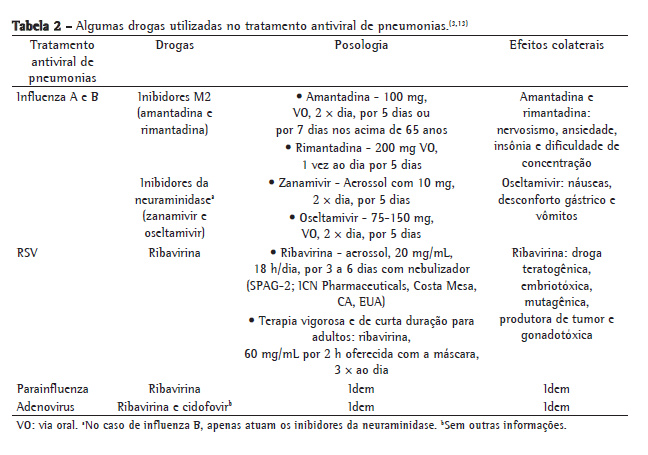O tratamento da pneumonia por RSV inclui medidas de suporte ventilatório e o uso do aerossol de ribavirina, como mostra a Tabela 2.