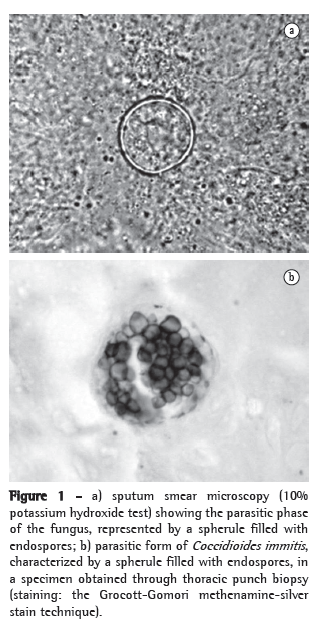 IntroductionCoccidioidomycosis is a systemic mycosis that affects humans and a wide range of animals. It is caused by the soil-dwelling dimorphic fungus Coccidioides immitis. The disease is acquired by inhalation of infective arthroconidia that live in the soil, where the fungus grows as a saprophyte, presenting filamentous growth.(1) The infection is usually benign and resolves spontaneously; however, a small proportion of infected individuals develop progressive, potentially lethal, infection that can affect not only the lungs but other organs through hematogenous dissemination.(2) Coccidioidomycosis, also known as Posadas-Wernicke disease, desert rheumatism, San Joaquin Valley fever and coccidioidal granuloma, is a systemic mycosis caused by C. immitis, a fungus that is endemic to arid and semi-arid regions in the American continent at latitudes between 40°N and 40°S; the southwestern United States and northern Mexico constitute the largest contiguous area to which the fungus is known to be endemic. It is also endemic to certain areas of Central America and South America.(3-6) The semi-arid northeastern region of Brazil has only recently been identified as an area endemic for coccidioidomycosis.(7-8) Because little is known about coccidioidomycosis in Brazil, it is likely that many cases of coccidioidomycosis are incorrectly diagnosed as nonspecific pneumonia, TB or even pneumoconiosis and silicosis. Based on molecular phylogeny studies, the existence of another species of the etiologic agent has been recently demonstrated. The species was "hidden" with C. immitis and was designated Coccidioides posadasii, after Alexandre Posadas, the man who discovered it. Therefore, it is currently established that C. immitis corresponds to the fungi isolated in California, particularly in the San Joaquin Valley, and the species C. posadasii is prevalent in all the remaining endemic areas of the American continent, from the southern United States to Argentina. Consequently, the etiologic agent of coccidioidomycosis in Brazil is designated C. posadasii.(9-14) In regular culture media at room temperature, the dimorphic fungi C. immitis and C. posadasii grow as saprophytes, forming vegetative mycelia that are hyaline, with whitish, cotton-like colonies. At the end of the third or fourth day of incubation, abundant growth is observed, forming hyaline hyphae, septate and ramified, the diameter of which ranges from 2 to 4 µm. Beginning on the fifth day of culture, a great quantity of arthroconidia is formed, alternating between degenerate and empty interseptal spaces of cytoplasm. When they detach themselves from the hyphae, the arthroconidia present thick walls and tend to arch, taking the shape of a barrel, measuring from 2 to 4 µm, and being generally multinucleated. Living parasitically in animal tissue and in special growth conditions in vitro, they present as spherules containing endospores.(15) The characteristic parasitic form is the spherule, observed in preparations of clinical specimens using potassium hydroxide or in histological sections stained using H&E staining, periodic acid-Schiff staining or the Grocott-Gomori methenamine-silver stain technique. They present as nonsprouting spherical or round elements of thick walls, ranging from 5 to 60 µm in diameter and, when mature, containing numerous small, globular and uninucleated endospores of 2-5 µm in diameter.(1,2,10-14,16)