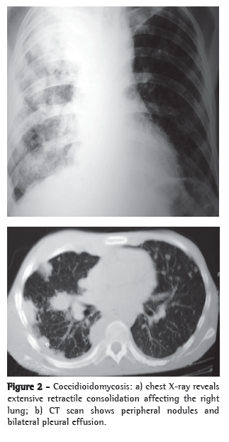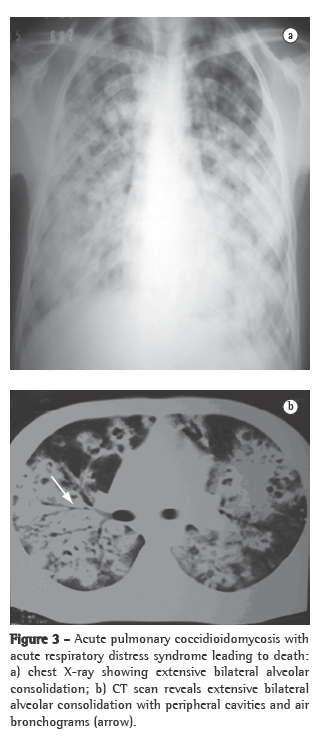 Primary pulmonary coccidioidomycosisThe most common form of presentation of coccidioidomycosis, primary pulmonary coccidioidomycosis is characterized by pulmonary manifestations that generally appear one to three weeks after exposure to the fungus. Approximately 60% of the infected individuals evolve to spontaneous cure without clinical or radiological manifestations. The remaining 40% generally present symptoms of acute respiratory disease, mimicking the flu, accompanied by fever, night sweats and cough or pleuritic chest pain, or a combination of the two. The manifestations appear between 10 and 15 days after exposure to the fungus, and the intensity of the symptoms depends directly on the infective load, ranging from the flu to a severe, nonspecific respiratory infection, accompanied by high fever, chest pain and cough with or without expectoration, as well as by general symptoms or allergic manifestations, particularly erythema nodosum. Primary pulmonary coccidioidomycosis generally resolves spontaneously within 30-60 days, even without antifungal treatment. However, approximately 5% of these patients develop residual pulmonary lesions (generally solitary nodules) that are asymptomatic in most patients. These cases are often diagnosed after surgical removal due to suspected lung cancer. Another 5% of these patients develop thin-walled cavities, solitary and juxtapleural, that might resolve spontaneously in approximately 2 years. In certain cases, principally in diabetic or immunocompromised patients, the acute pulmonary form does not resolve; it progresses to chronic pneumonia and is characterized by the formation of pulmonary cavitation. The lungs might also be diffusely affected as a result of the inhalation of a large quantity of infective arthroconidia or as a late and secondary presentation resulting from hematogenous dissemination. These forms present with multiple diffuse infiltrates, the largest of which might present cavitation accompanied by severe respiratory manifestations, which can lead to respiratory failure and are more commonly observed in immunocompromised patients. The disease might progress to death, mimicking septic shock, accompanied by acute respiratory distress syndrome, with high mortality rates.(13,27)