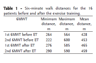 In the interpretation of these results, it is necessary to take into consideration the size of the sample (only 16 patients completed the study). No significant (> 10-m) differences were observed in the post-ET six-minute walk distance. Sinces the mean value of the initial six-minute walk test was already high (> 450 m), the reduction in HR after the ET program, even if slight, can translate to better final performance.