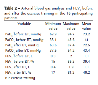 The patients were evaluated at baseline (T0) and at the end of the ET program (T1) using the following parameters: oxygen desaturation; sensation of dyspnea-as evaluated with the MMRC and Borg scales; sensation of fatigue of the lower limbs-as determined with the Borg scale; quality of life-as evaluated with the St. George's Respiratory Questionnaire (SGRQ); six-minute walk distance; plethysmography results at T0; spirometry values at T1; and arterial blood gas exchange.