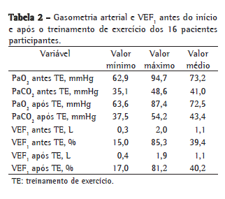 Incluíram-se no protocolo 20 pacientes com DPOC (estádios III/IV do Global Initiative for Chronic Obstructive Lung Disease), ex-­tabagistas, e em fase de estabilidade clínica. O valor médio do índice BODE desse grupo de pacientes antes de iniciar o treino era 4 (variação, 2-6).