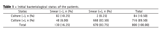 The mean age of the patients was 39 ± 14 years (range, 16-75 years). The mean symptom duration was 113 ± 196 days (median, 120 days). The number of patients who reported close contact with an active tuberculosis patient was 193 (24.1%). The most common concomitant diseases were diabetes, reported by 81 patients (10.1%), and COPD, reported by 80 patients (10.0%). The initial mean ESR was 58 ± 37 mm/h. Initial sputum smears for AFB and cultures for M. tuberculosis were positive in 83.8% and in 89.5% of the patients, respectively (Table 1).