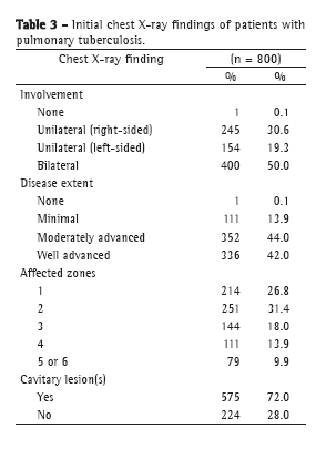 The radiological classification of disease extent was as follows(18): minimal PTB (when the lesions did not cross the area above the sternal cartilage of the second rib on one side); moderately advanced PTB (when moderately advanced lesions could be seen in one or both lungs, with disseminated lesions of low to moderate density extending throughout one lung or the equivalent in both lungs, or dense, confluent lesions limited to one-third of the volume of one lung); and well advanced PTB (when the lesions were even more extensive). On the chest X-rays, lungs were also divided into upper, middle and lower zones, which were delimited by the upper border of the second and fourth anterior ribs, and all six zones were assessed for findings indicative of tuberculosis.