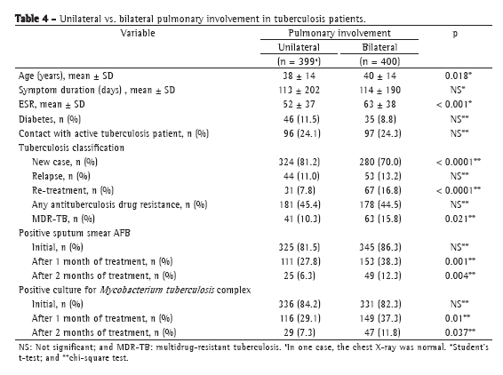We first evaluated the differences between unilateral and bilateral pulmonary involvement (Table 4). The number of patients with unilateral involvement (n = 399) was nearly equal to that of those with bilateral involvement (n = 400). One patient had a normal chest X-ray. There were no significant differences between the patients with unilateral involvement and those with bilateral involvement in terms of concomitant diabetes, which was observed in 46 (11.5%) and 35 (8.8%) of the patients, respectively (p > 0.05), contact with an active tuberculosis patient, which was reported in 96 (24.1%) and 97 (24.3%), respectively, (p > 0.05), or the time from symptom onset to treatment initiation (113 ± 202 days vs. 114 ± 190 days; p > 0.05). However, the number of cases of re-treatment was more than twice as high among the patients with bilateral involvement. After the first month of treatment, the proportion of patients with positive cultures was significantly greater in the patients with unilateral involvement (37.3% vs. 29.1%; p = 0.01), although this difference did not retain its significance after the second month (7.3% vs. 11.8%; p = 0.037). Patients with bilateral involvement on chest X-rays were slightly older than were those with unilateral involvement (40 ± 14 years vs. 38 ± 14 years; p = 0.018) and were more likely to have previously been treated for tuberculosis (p < 0.001).