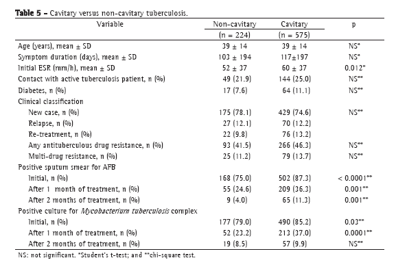 Table 5 shows the comparison between the patients with cavitary disease and those without. After the first month of treatment, the proportion of patients with positive culture results was higher in those with cavitary disease than in those with non-cavitary disease (53.7% vs. 37.7%; p < 0.0001), as was the proportion of patients with positive smear microscopy results (36.3% vs. 24.6%; p = 0.001). After the second month of treatment, there were no differences between the two groups in terms of the culture results, although the proportion of smear-positive patients remained significantly higher in the cavitary disease group (p = 0.001).