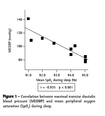 There were no differences between the groups in terms of maximal exercise systolic blood pressure or DBP during maximal exercise, although the desaturator group presented a good correlation between DBP during maximal exercise and mean SpO2 during sleep, as has been reported in studies involving patients with OSAS.(15,18) We can speculate that this correlation might be an initial presentation of the systemic arterial hypertension that develops in patients with nocturnal oxygen desaturation, since the autonomic dysfunction in blood pressure control, due to upregulation of the baroreflex controlled by carotid bodies, has been well established in experimental models and clinical studies of OSAS.(11)