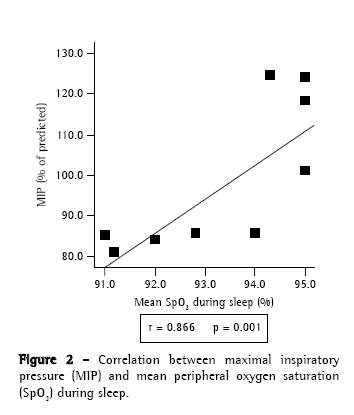 The groups did not differ in terms of peripheral strength as measured by MVIC or strength generated by respiratory muscles, indicating that, on average, the patients in the desaturator group maintain their capacity to generate strength preserved when compared to those in the nondesaturator group. We point out that MIP (% of predicted) correlated with mean SpO2 during sleep in the sample as a whole and, especially, in the desaturator group, corroborating findings in the literature.(26) It is known, however, that high-intensity training of the respiratory musculature can reduce the depth of nocturnal oxygen desaturation,(27) although this was not the case in our patients.