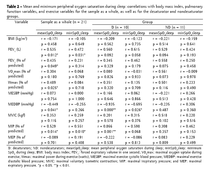 Among the limiting factors of this study is the fact that fat-free mass, which could better characterize a relationship between exercise capacity and nocturnal hypoxemia, was not measured. Another limiting factor is the desaturation criterion adopted. Although some authors recommend using a 10% drop in saturation or saturation below 90% during more than 30% of total sleep time,(1) we followed the recommendation of Block et al.(22) since this was a study involving patients with mild to moderate COPD, in whom those criteria would rarely be met.