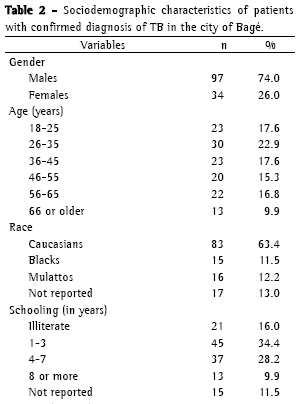 Women sought treatment more often than did men. Nevertheless, the prevalence of TB was higher among males (male/female ratio of approximately 3:1). The mean age was 49 years (range, 18-81 years). Most of the patients were Caucasian. The prevalence of TB was also higher among patients with a limited amount (less than 7 years) of schooling (Table 2).