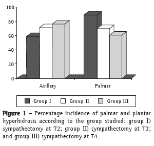 Objective: To compare different levels of ablation in terms of the degree of patient satisfaction and extent of postoperative reflex sweating in sympathectomized patients. Methods: A retrospective study involving 521 patients with primary hyperhidrosis, submitted to thoracic sympathectomy at the Monte Sinai Hospital and University Hospital of the Federal University of Juiz de Fora, from January of 2001 to December 2005. All patients were submitted to thermal ablation of the sympathetic stem and were divided into three groups: up to T2 (group I, n = 162); up to T3 (group II, n = 65); and up to T4 (group III, n = 294). Results: Optimal postoperative control of palmar/axillary hyperhidrosis was achieved in, respectively, 94/82% of the patients of group I, 89/89% of those in group II and 80/80% of those in group III. Postoperative reflex sweating was observed in 67% of the patients in groups I and II, compared with 61.29% of those in group III. Severe reflex sweating occurred in 32% of the group I patients, 9% of the group II patients and 4% of the group III patients. Conclusion: Sympathectomy provided excellent patient satisfaction and a low incidence of complications. There was no significant difference between the levels of ablation in terms of reflex sweating, although the intensity of this complication decreased when lower levels of blockage, principally at the T4 level, were employed.