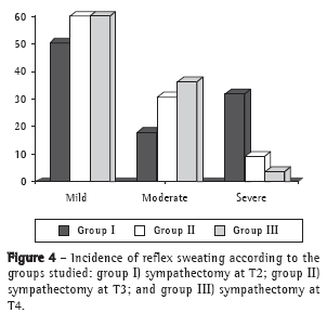 Initially, we used T2 and T3 ablations in the treatment of palmar and axillary hyperhidrosis. Based on relevant publications,(19) we began to perform T4 ablations, and observed a reduction in the incidence of reflex hyperhidrosis (67% in groups I and II vs. 61.29% in group III, p < 0.05). (Figure 1)