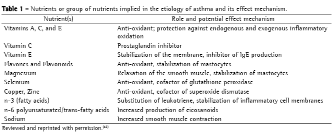 In parallel, studies involving children and adults have revealed an inverse association between intake of vitamin E/vitamin C and asthma/atopy, suggesting that these substances play a protective role.(27,28) However, the potential effects of certain nutrients, such as the so-called immunomodulators, are debatable, principally regarding the possibility of preventing or minimizing the risk of asthma and respiratory allergies through interventions with dietary supplementation. Since symptomatic asthma in adults is associated with low intake of fruits, nutritional anti-oxidants, vitamin C, and magnesium, it has been suggested that the diet is a potentially modifiable risk factor for the development of asthma.(29)