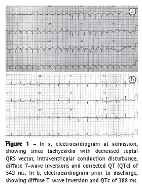 Six hours after admission, the patient developed cardiogenic shock. She was given large doses of catecholamines (dobutamine and noradrenalin), was submitted to endotracheal intubation, and required mechanical ventilation. She underwent emergency cardiac catheterization, which showed that her coronary arteries were normal. Cardiogenic shock reverted within 48 h, with an LV ejection fraction of 60% (Figures 2c and 2d). After a follow-up period of 2 years, she had normal LV function and QTc of 388 ms (Figure 1), without major adverse cardiac events.