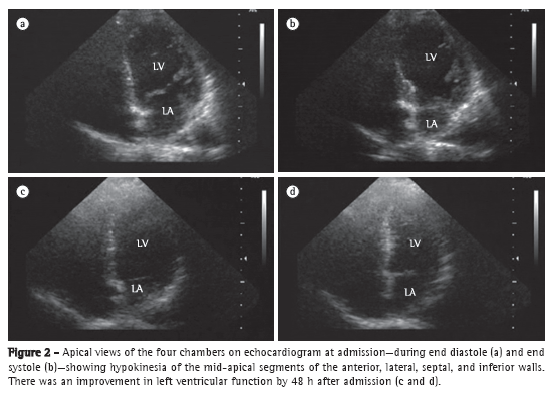 This case was unusual in various aspects. Initially, the triggering factors were exacerbation of bronchial asthma and use of large doses of beta agonists. She then developed cardiogenic shock, becoming dependent on inotropes. The patient met all of the Mayo Clinic diagnostic criteria for takotsubo cardiomyopathy, which include transient LV contractile dysfunction, extending beyond the territory of a single epicardial coronary artery; absence of obstructive coronary disease or angiographic evidence of acute plaque rupture; the development of abnormalities on electrocardiogram or elevated cardiac troponin; and absence of pheochromocytoma or myocarditis.(7) Due to massive catecholamine release, it is recommended that neither large doses of beta mimetics (for treating severe asthma exacerbations) nor sympathomimetics be used. Prolonged use of adrenaline-like substances with inotropic effects can increase the already high circulating levels and augment oxygen consumption, worsening myocardial stunning. This is also associated with the overproduction of oxygen-derived free radicals in these patients.