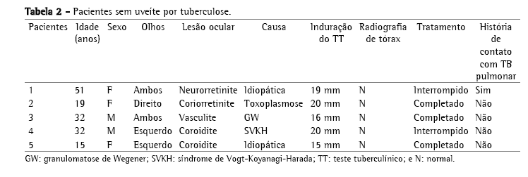 Dos 5 pacientes com diagnóstico final de não-UTB, 3 apresentaram uveíte posterior (neurorretinite idiopática, coroidite idiopática e retinocoroidite toxoplásmica), e 2 apresentaram uveíte difusa (síndrome de Vogt-Koyanagi-Harada e granulomatose de Wegener, respectivamente), sendo que a doença era unilateral em 3 casos e bilateral em 2 (Tabela 2). A média da induração do TT foi de 18 ±2,35 mm. Dos mesmos 5 pacientes, 3 haviam recebido medicamentos anti-TB por até 3 meses, sem nenhuma melhora clínica, e 2 haviam completado o tratamento, mas apresentaram reativação da uveíte durante o acompanhamento. No caso diagnosticado como retinocoroidite toxoplásmica, o diagnóstico foi tardio, uma vez que o paciente foi inicialmente tratado para toxoplasmose, sem nenhuma melhora, foi então tratado para UTB, ainda sem nenhuma melhora, e foi finalmente tratado com sucesso para toxoplasmose (lesão cicatrizada). História de contato com TB pulmonar foi relatada somente pelo paciente com características clínicas compatíveis com a síndrome de Vogt-Koyanagi-Harada, o qual, embora tenha apresentado sinais de manifestações tardias durante o reexame, apresentou cicatrização satisfatória. O paciente diagnosticado com granulomatose de Wegener foi submetido à enucleação de um olho devido à subseqüente esclerite que causou descolamento da retina e olho cego doloroso (confirmados por meio do exame histopatológico). Esse paciente respondeu bem à pulsoterapia e aos corticosteróides sistêmicos. Os 2 pacientes não-UTB restantes (aqueles diagnosticados com neurorretinite idiopática e coroidite idiopática, respectivamente) apresentaram doença intermitente e foram tratados com corticosteróides orais durante as crises.