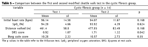 In comparing the first and second MSWTs, we found that, in the control group, the pre-test dyspnea at rest scale score was higher (greater perceived fatigue) prior to the second test (p = 0.014). However, on average, the control group children walked a greater distance in the second test than in the first test, and this difference was statistically significant (p = 0.036). In both groups, the only statistically significant difference between the first and the second test was in the dyspnea at rest scale score, which was significantly higher for the second test (p = 0.042) in the cystic fibrosis group and in the control group (Tables 4 and 5, respectively).