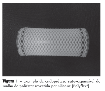 Considerando-se os prós e contras dos dois tipos de endopróteses disponíveis, foi desenvolvida uma endoprótese auto-expansível de malha de poliéster revestida por silicone (Polyflex®), visando um dispositivo de fácil implantação, fácil remoção, difícil migração, que provocasse pouca reação de granulação e tivesse uma relação favorável entre os diâmetros externo e interno (Figura 1 e 2). Estudos experimentais demonstraram que a endoprótese é de fácil aplicação, efetiva e bem tolerada.(12,14)