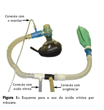 Para realização do TVRP, o óxido nítrico é utilizado por via inalatória, acoplado ao tubo endotraqueal, à cânula laríngea ou à máscara facial, sendo esta a mais utilizada em adultos. Ele é administrado por conexão em "T" ou "Y" na via inspiratória, cerca de 30 a 40 cm da entrada das conexões com a via respiratória (Figura 1). A entrada mais proximal é reservada para a conexão com o monitor. Das duas distais, uma (a mais distal) é usada para a conexão com o oxigênio/ar, e a outra, para a conexão com o óxido nítrico.
