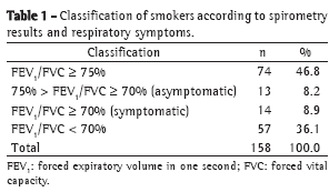MethodsWe evaluated 158 smokers, aged =40 years, of both genders, who participated in the Paulista State University at Botucatu School of Medicine smoking cessation program between January of 2003 and November of 2005. In order to be included in the program, patients reported their smoking and clinical history, which included a specific survey on the presence of respiratory symptoms and previous diagnosis of COPD and other tobacco-related diseases.